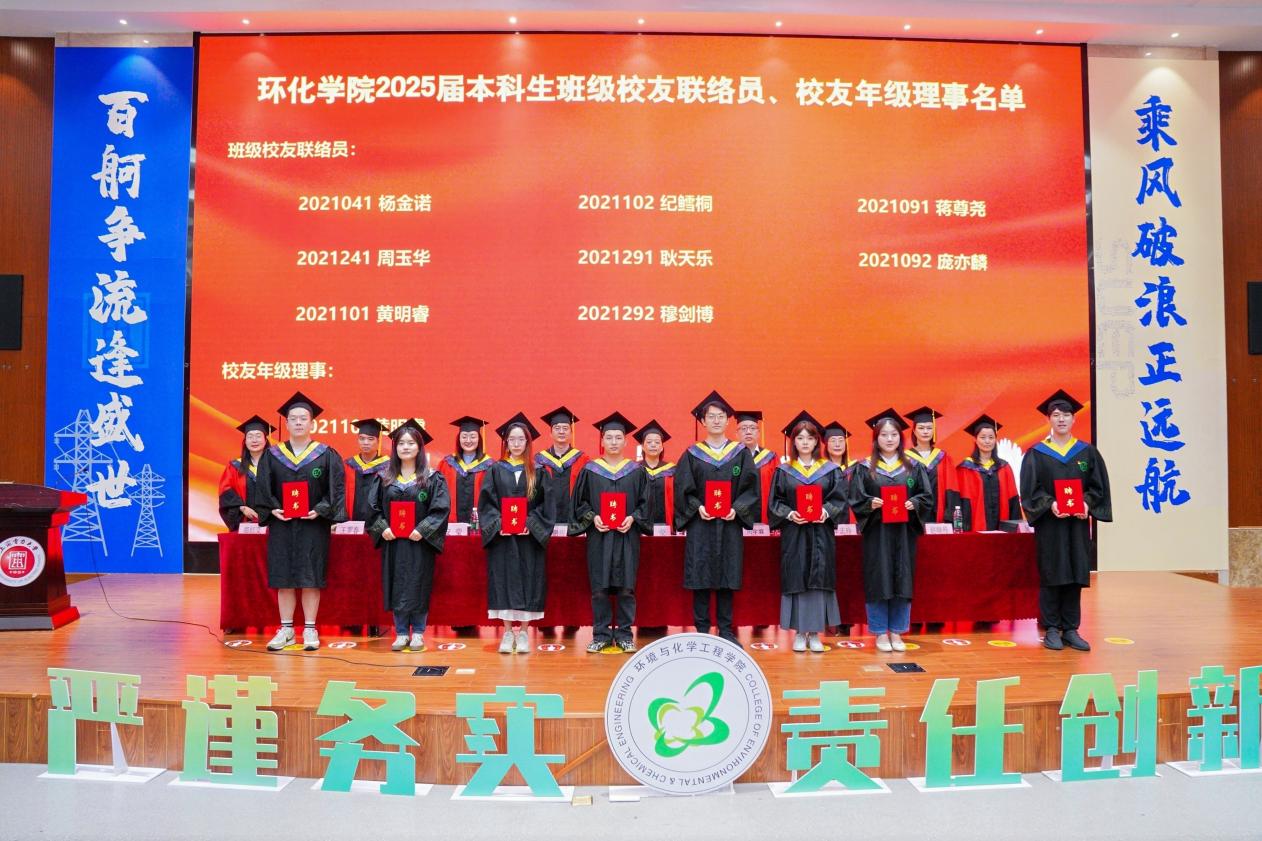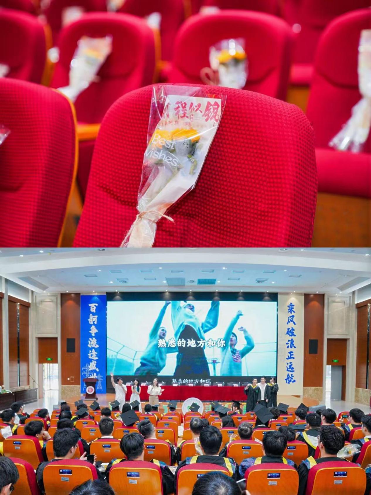 歌声与花束共叙情谊。入场环节中,毕业生们在暖场音乐里陆续就座。每个座位上,学院提前摆放的向日葵花束在灯光下闪耀温暖光芒。师生精心编排的歌曲串烧《把爱留在环化》点燃现场,辅导员与毕业生代表合唱《再见》引发全场合唱,歌声流淌着同窗情谊与师恩难忘。这束向日葵承载“心向朝阳、勇毅前行”的寄寓,成为典礼中最暖心的风景。