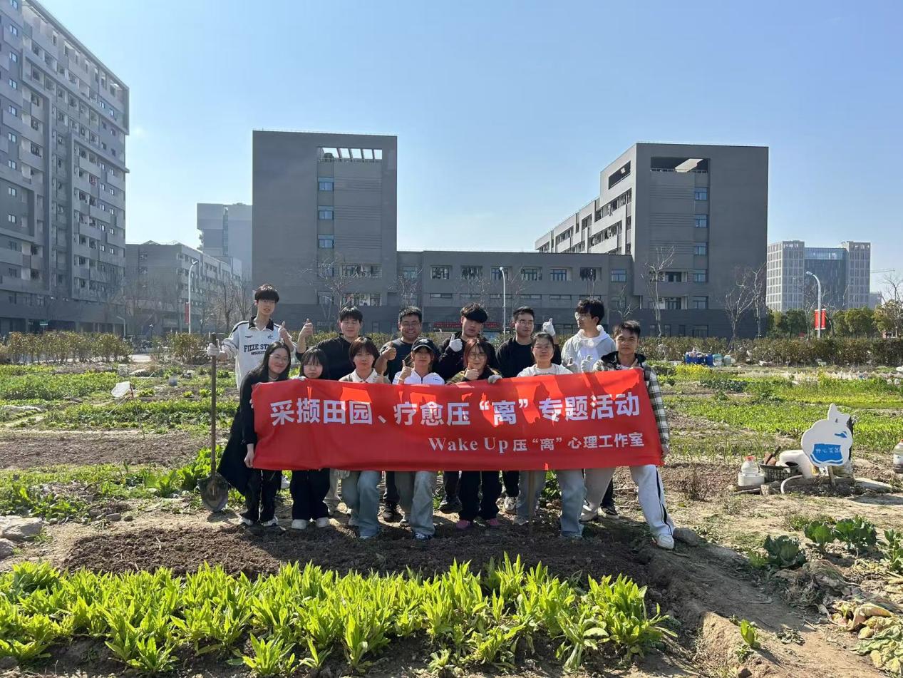 活动当日,阳光正好,同学们满怀热情地齐聚“疗愈菜园”。他们手持农具,认真进行松土播种、修剪枝叶等农事劳作。Wake Up压“离”心理工作室负责人王涛老师穿梭其中,现场指导同学们运用“正念种植法”,引导大家专注于呼吸节奏,感受大自然韵律与生命韧性。同时,王涛开展“五感减压法”,引导同学们调动视觉、听觉、嗅觉、味觉、触觉,体会劳动中的“心流体验”。这种独特体验有效缓解同学们压力,让大家在自然与劳作中找到情绪出口。参与活动的崔静远同学感慨:“在繁忙学习里,亲近自然机会难得。这次活动如钥匙,打开内心放松之门。手握锄头、脚踏土地,劳作让压力转化为前进力量,使我学会在忙碌中找生活美好。”