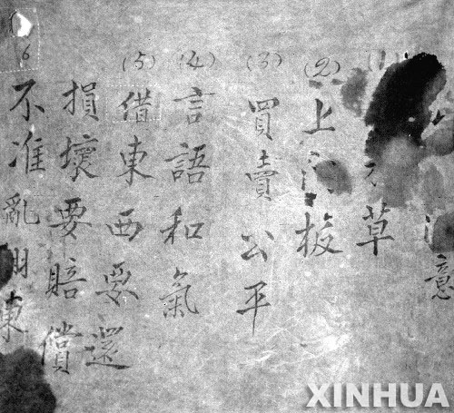 图片是红军战士的包袱皮,上面写着毛主席在井冈山斗争时期为红军制定的“三大纪律 六项注意”(后发展为“三大纪律 八项注意”)