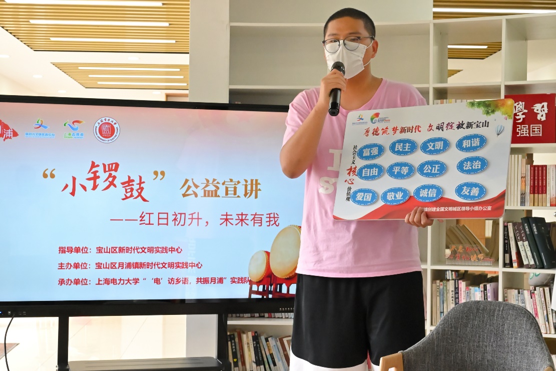 实践队积极参与宝山区文明办、月浦镇新时代文明实践分中心主办的小锣鼓公益课堂中,第一讲以“乡村振兴正当时”主题,结合个人所思所想和生活经历,从“习近平新时代中国特色社会主义思想”中加快发展乡村产业、加强社会主义精神文明建设、加强农村生态文明建设、深化农村改革、实施乡村建设行动、推动城乡融合发展见实效、加强和改进乡村治理等七个方面展开,强调了当前乡村振兴的“主旋律”是以习近平新时代中国特色社会主义思想为指导,贯彻落实各项制度。第二讲以“社会主义核心价值观”为主题,以青少年的视角,围绕“爱国”与“自由”进行具体而生动的阐释,引导孩子们树立爱国主义精神,“安全过暑假”的意识。实践队队长彭征说:“我们希望通过大学生的青年视角,对相关理论进行更加接地气的阐释,帮助当地村民能自觉地强化思想道德,共同建设文明乡风和淳朴民风,将社会主义核心价值观能更好地内化于心、外化于行。”