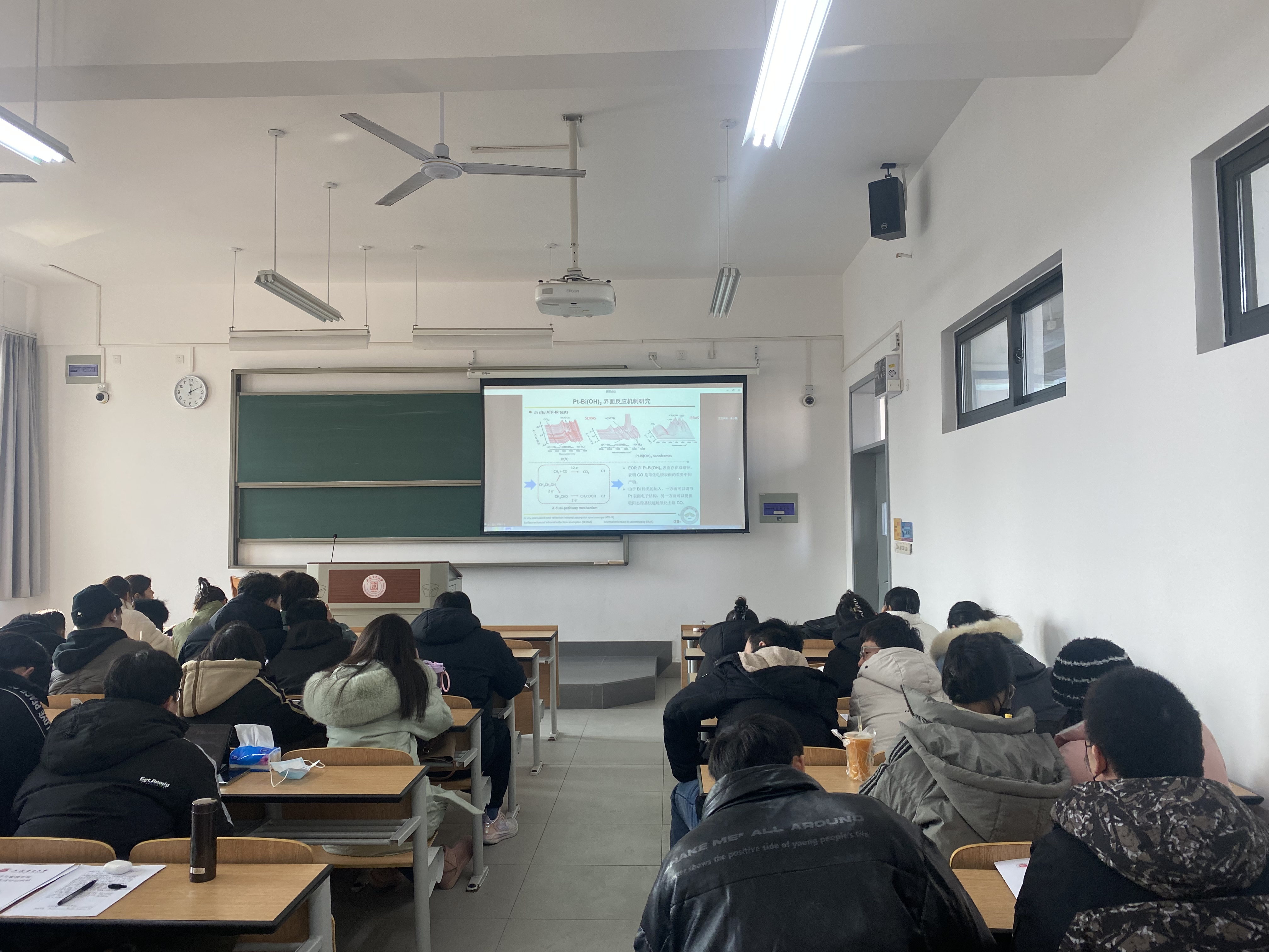 紧接着,袁小磊教授便提到了突破高效抗毒化Pt催化剂的精准设计并降低Pt载量对推动我国氢能源汽车产业发展具有迫切的现实需求。首先,袁教授介绍了CO在Pt表面吸附方式及氧化去除策略。在CO覆盖度较高时,CO在Pt表面的吸附方式为:1.桥式吸附:在低电势下(500mv)被氧化。2.线式吸附(主要):在高电势下(600-800mv)被氧化。而对于CO的氧化去除策略,我们则要重点关注1.d带中心理论与表明偏析。2.张力效应、配体效应和聚集体效应。3.晶面取向效应。随后,袁小磊教授又讲述了合金化策略对CO吸附的影响:1.第二元素的加入可以有效地调节Pt电子结构。2.调控Pt催化剂表面CO等中间产物的吸附状态。以及讲述了界面结构协同效应对CO吸附的影响:1.大的比表面积。2.有效地调节Pt电子结构。3.提供羟基,氧化去除吸附的CO。最后,袁小磊教授又根据自己从best365中国官方网站到苏州大学再到耶鲁大学的求学经历,积极劝导我们作为学生需要保持一颗平常心。要既有长远的目标,也有短期的目标。还要懂得科研很苦,但是坚持很酷得道理。诚挚希望同学们要在做科研的同时积极锻炼,要对未来有美好的愿想。