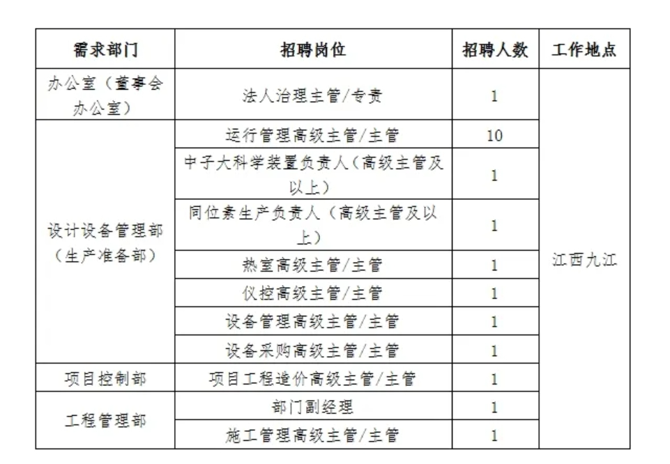 江西核电有限公司于2007年12月在南昌成立,是国家电投直接管理的二级单位和重要区域能源企业,主要业务涉及核电项目投资、建设与管理、核技术应用、新能源项目开发等领域。公司始终围绕中国“3060”目标,聚焦国家电投“2035一流战略”,统筹推进核能拓展和智慧能源开发。2022年以来,公司重点推进先进科学技术研发中心项目,致力于开展先进燃料、材料等基础科学研究,规模化生产医用同位素,推动技术攻关及相关产业的高质量发展。根据公司发展需要,现面向集团公司系统内外公开招聘相关岗位。具体事项公告如下: