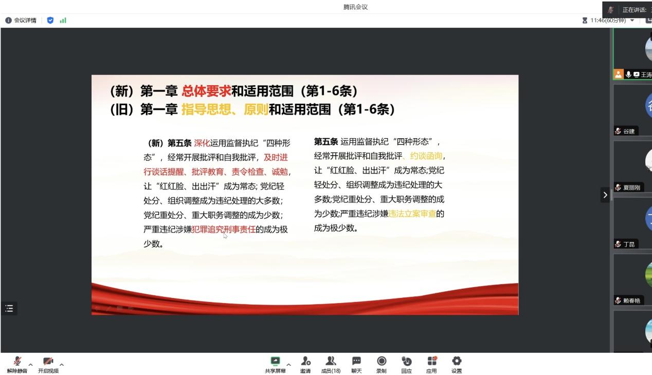 会上,闵宇霖传达学校对于本次理论学习的相关会议精神,要求团队成员认真学习,真正的把党纪学习教育入脑入心。团队联络员王涛就《中国共产党纪律处分条例》(1--7章)的内容包括:总体要求和适用范围、违纪与纪律处分、纪律处分运用规则、对违法犯罪党员的纪律处分、其他规定、对违反政治纪律行为的处分、对违反组织纪律行为的处分开展了逐字逐句、原原本本领学。团队成员就学习感悟在会上做了交流发言。随后,团队成员逐个汇报近期的研究成果进展。