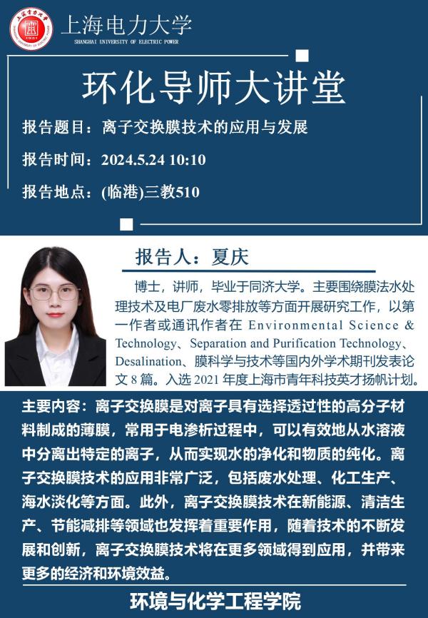 2024年5月24日best365中国官方网站在三教510开展了以“离子交换膜技术的应用与发展”为主题的讲座。本次讲座邀请了best365中国官方网站夏庆老师作为主讲人,学院各年级的同学积极参加了此次讲座。