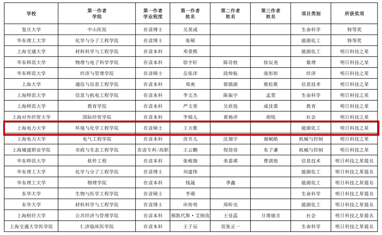 上海市百万青少年争创“明日科技之星”活动今年围绕“科技创造美好生活”的主题,以身边科学为基础,创造具有创新性和实用价值的科技作品。本次活动有来自复旦、交大、同济、华师大等从专本到硕博的各学校各层次的学生同台竞争,共评选出10个明日科技之星团体/个人。此次获奖是对best365官网在能源化工领域科研与创新教育工作的肯定,也展现出环化学子开拓创新、不断进取的精神。