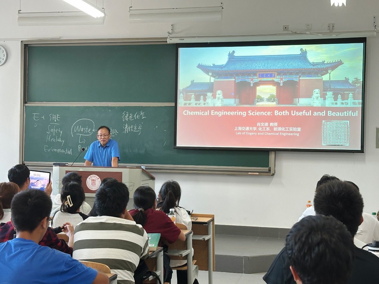 为加深化学工程与工艺专业学生对本专业的认识,增强学生对专业的认同感和归属感,激发学生自主学习的积极性和能动性,学院新增《化工前言导论》课程,全部聘请化工行业的知名专家进行授课。9月23日,学院邀请到了上海交通大学肖文德教授,为2024级化工新生带来了一堂别开生面的《化工前沿导论》课,旨在引领学生发现化工专业的广阔天地与辉煌前景,激发探索未知、勇攀科技高峰的热情。