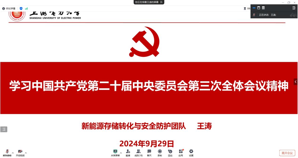 为深入学习贯彻党的二十届三中全会精神,引领广大党员凝心聚力、学思践悟、笃行实干,推动党的二十届三中全会精神入脑入心,促进团队高质量发展。9月29日下午新能源存储转化与安全防护创新团队召开党员先锋队理论学习研讨暨团队发展研讨会。团队全体成员参加,会议由团队队长闵宇霖主持。