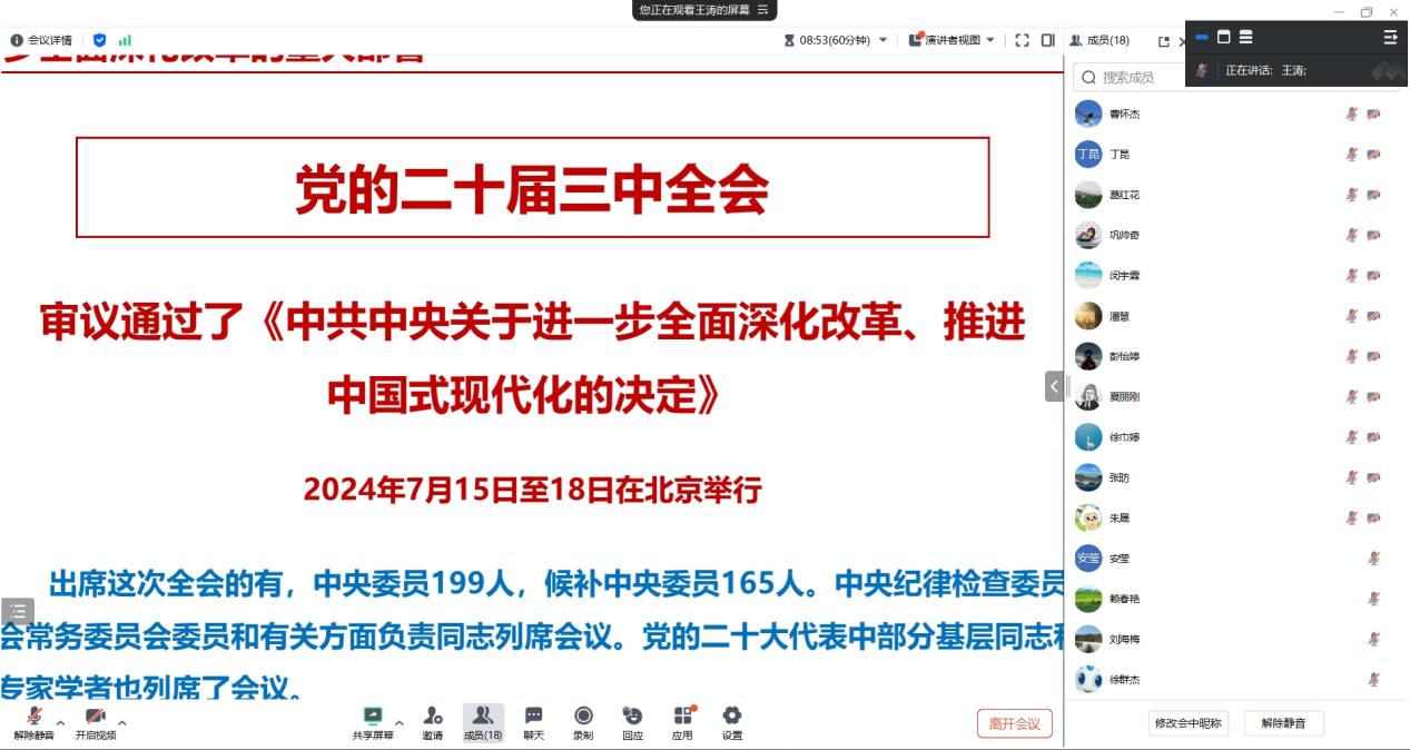 团队联络员王涛带领团队成员就《中共中央关于进一步全面深化改革、推进中国式现代化的决定》展开了深入地学习。他带领成员学习改革开放后历次党的三中全会的主要议题与成果。分别按照推进中国式现代化对进一步全面深化改革提出新要求、推进中国式现代化的重大部署、为中国式现代化注入新动能、在发展中保障和改善民生等四个方面进行解读。他强调党的二十届三中全会是以习近平同志为核心的党中央在以中国式现代化全面推进强国建设、民族复兴伟业的关键时期召开的一次极为重要的会议。全会审议通过的《决定》,紧紧围绕推进中国式现代化这一中心任务,对进一步全面深化改革作出系统部署,是站在新的历史起点上推动全面深化改革向广度和深度进军的总动员,是指引新征程改革开放的重要纲领性文件,对于确保实现党的二十大确定的战略任务、全面建成社会主义现代化强国、实现第二个百年奋斗目标,具有重大而深远的意义。随后,团队成员就学习感悟在会上做了交流发言。