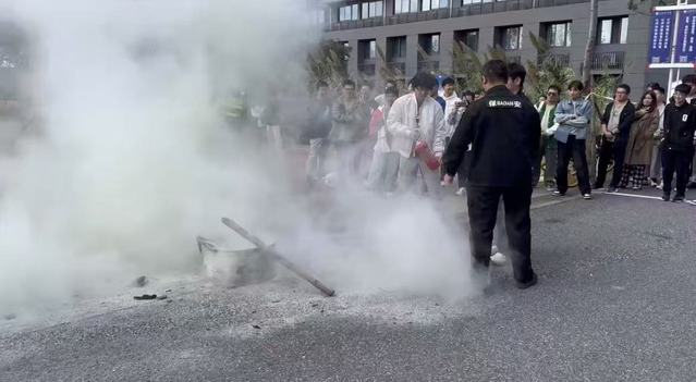 3分钟后环化楼所有人员安全疏散完毕。随后,保卫处老师为师生们上了一堂生动的安全教育课。他们详细介绍了灭火器的种类和使用方法,并结合“提拔握压”的操作口诀,现场演示了灭火器的正确使用方法。师生们积极参与灭火实操训练,亲身体验了灭火器的使用过程,进一步掌握了灭火技能。