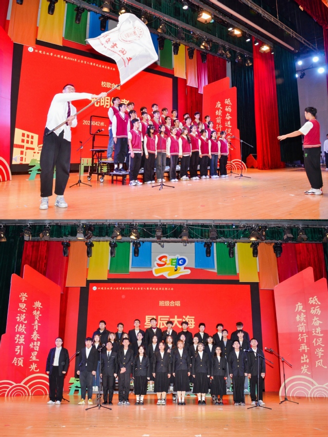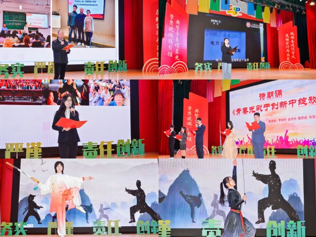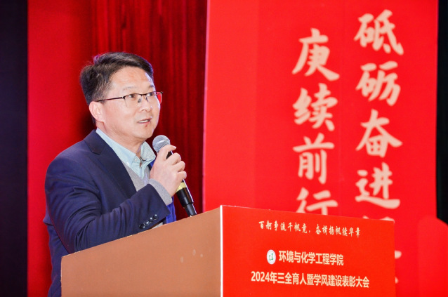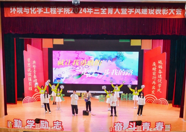 会上,获奖教师代表廖强强以《亦师亦友共成长》为题,借古希腊哲学三问“我是谁”“我从哪里来“我到哪里去”深入阐述个人职教生涯的宝贵心得,并对同学们予以深切的教导与劝勉。环境工程系第二学生党支部黄玥,以《“电力义工”守护万家灯火》微党课,生动展现时代楷模钱海军事迹,激励同学们传承其无私奉献精神,在实践与志愿服务中书写青春华章。国家奖学金获得者、2022 级应用化学专业的蔡钰,通过《等风来不如追风去》分享大学学习成长经历,彰显环化学子自强不息风貌。学院“锌星之火”理论宣讲团成员带来《青春光彩于创新中绽放》诗歌朗诵,以激情澎湃的语调,展现科技创新赋予青年的无限可能与光辉前景。2023 级张筱筱、张佳杰、周子懿等同学带来《古韵新姿》表演,用武术与舞蹈精妙融合打造视觉盛宴,呈现传统与现代融合的美育魅力。最后,大会在 2024291 班与 2024042 班合唱的《星辰大海》及校歌《光明使者》优美旋律中圆满落幕。
