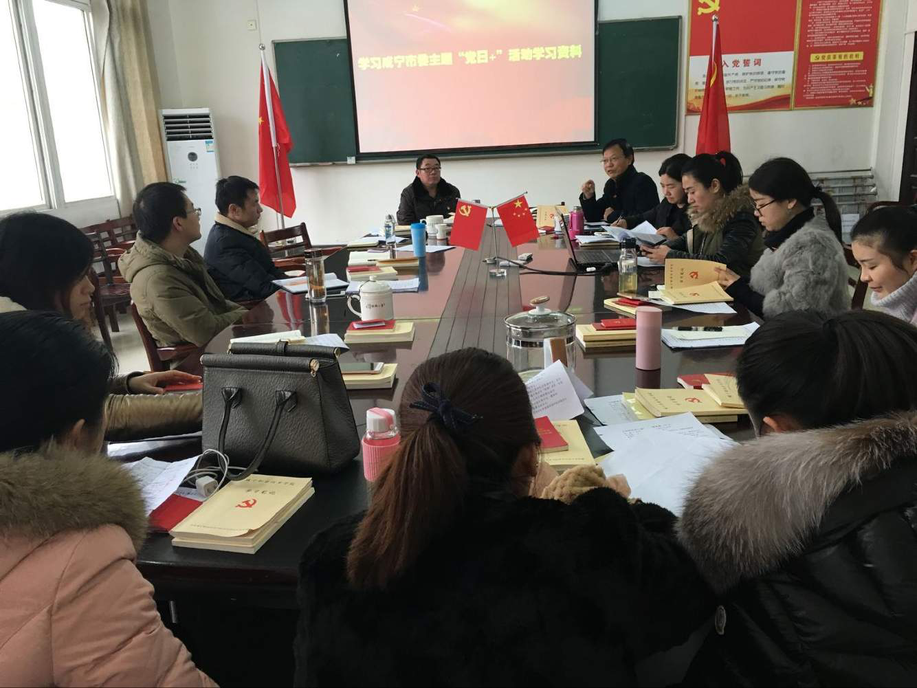 会议第四项报告生活会,民主评议党员情况,通报民主评议结果。会议第五项,组织学习咸宁市主题党日+活动学习资料。