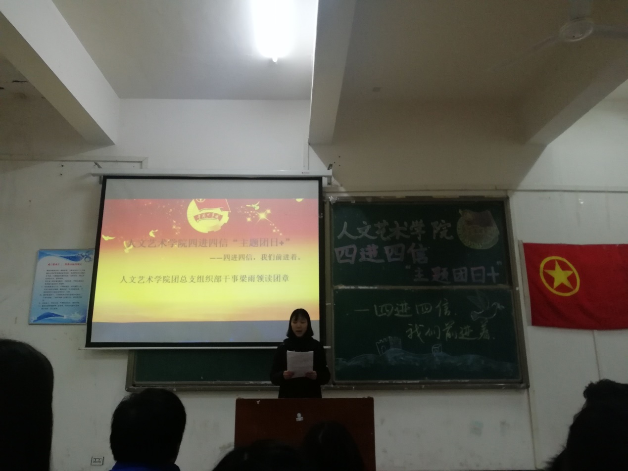 活动在充满蓬勃朝气和青春气息的《光荣啊,中国共青团》的乐声中开始。活动在充满蓬勃朝气和青春气息的《光荣啊,中国共青团》的乐声中隆重开始。团总支组织部干事梁雨同学领读团章,温故团章,增强了大家争做新时代合格共青团员的意识。18级学生代表吴宇清上台发言, 她详细阐述了“四进四信”的主要内容,“四进”即进支部、进社团、进网络、进团课,“四信”即信仰、信念、信任、信赖,并表示作为一名共青团员应当是年少有为,而非碌碌无为。团总支组织部干事聂腾宣读“主题团日+”具体内容以及相关要求,通过他们的宣讲,大家对“四进四信”有了更深刻的理解,并深刻体会到作为新时代的共青团员,要紧跟党的步伐不断前进。