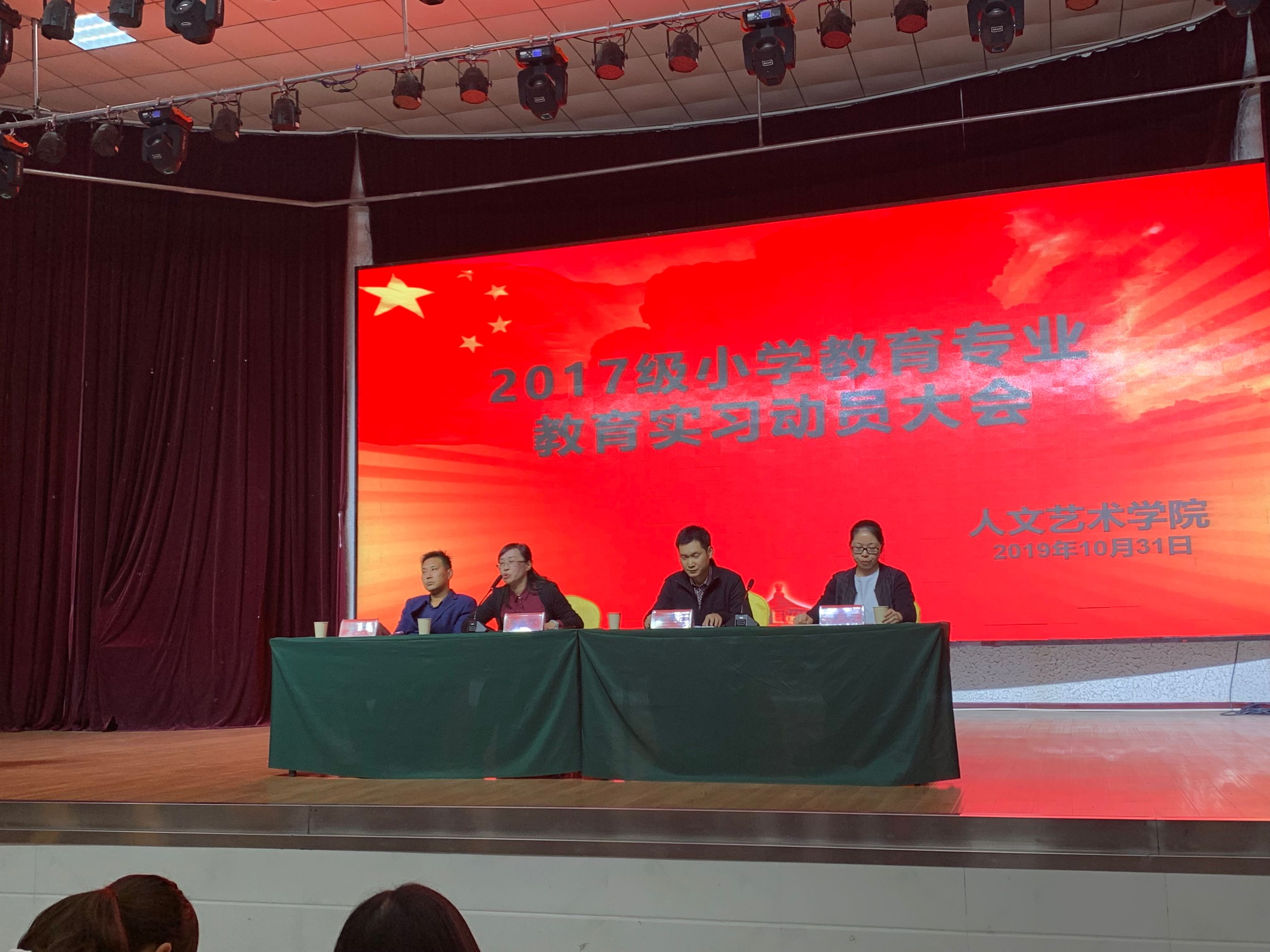 2019年10月30日晚7点,beat365在线唯一官网在大学生活动中心召开2017级小学教育专业教育实习动员大会。本次大会强调的主要内容有教育实习动员、实习技能、实习职责、安全等方面,参会的领导有院长余永欢,学工副院长杨帅、教学代理副院长方朝阳、小教教研室主任肖琼。