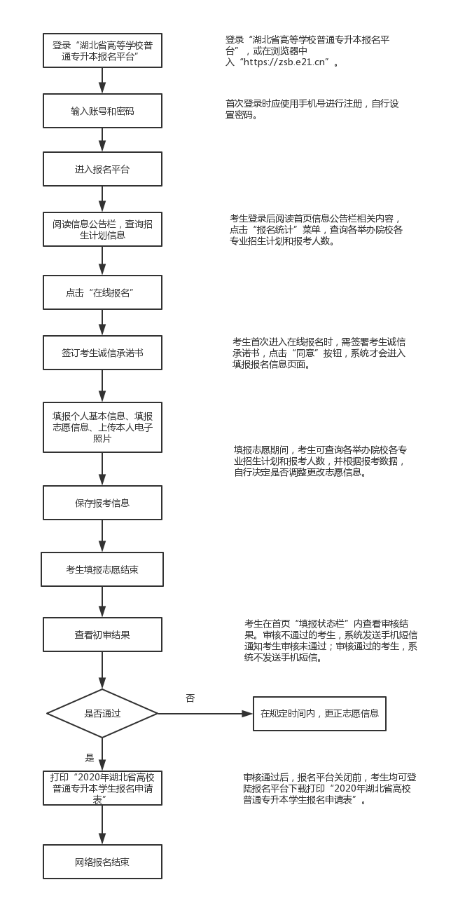 所有已通过高校专业志愿审核的考生在此期间通过报名平台下载打印《2020年湖北省高校普通专升本报名申请表》,确认网络报名成功。