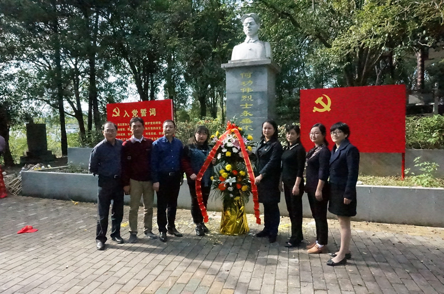 在桂花镇花园村的何功伟烈士纪念园,全体党员向何功伟烈士敬献花蓝、重温入党誓词,桂花镇文化站吴站长为大家讲解了何功伟被捕、国民党企图利用其父亲劝降遭拒,最终宁死不屈、英勇就义的感人故事,大家对何功伟烈士如此执着的共产主义信念和建设新中国的理想初心表示由衷的叹服和敬佩。