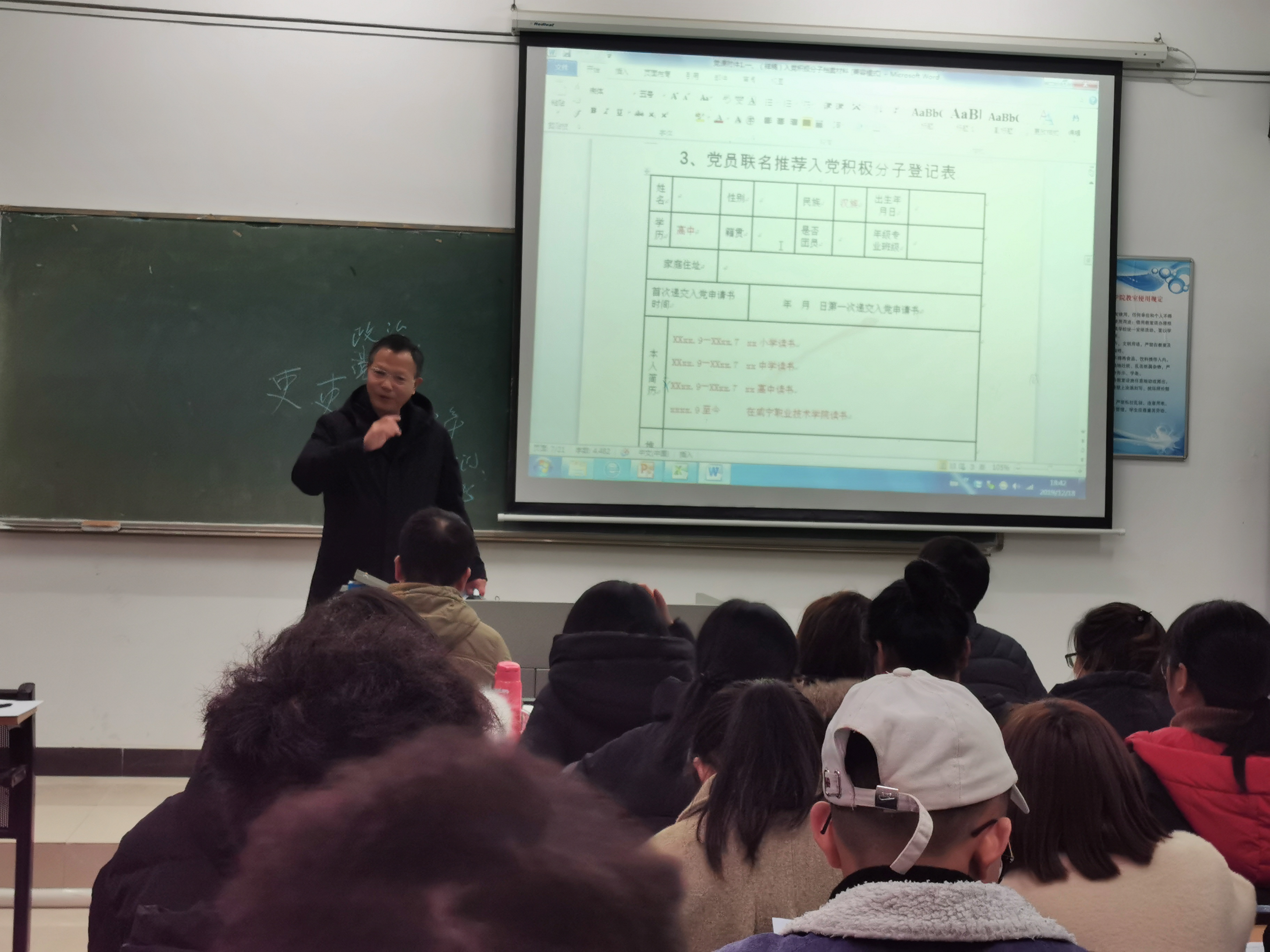 活动开始,党总支书记卢臻简要的介绍了此次会议的目的,随后,就对参会人员开展了入党积极分子工作的培训。