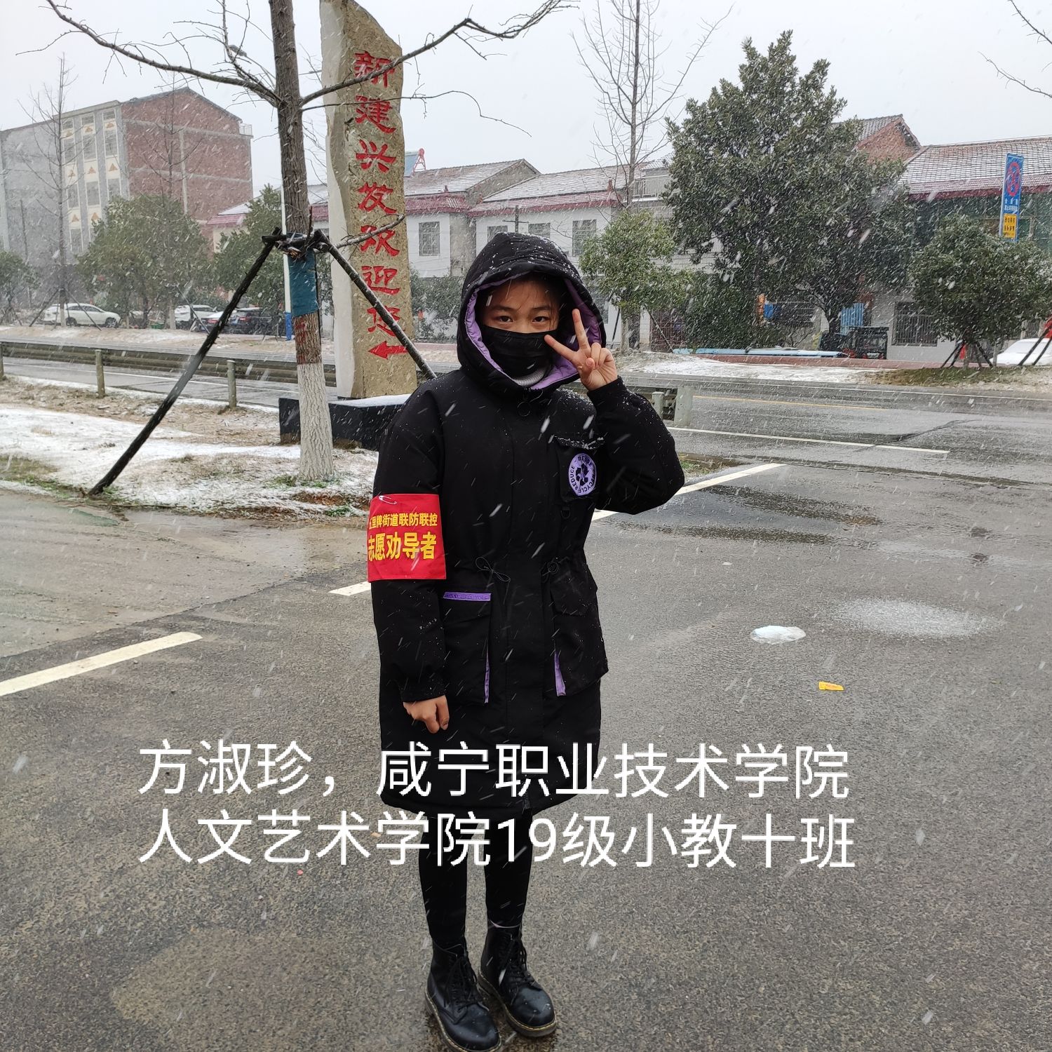 来自19级小学教育的方淑珍,当村委会在上级指导下紧急招募志愿者展开村级防控工作时,方淑珍同学及时报名,她是全村52名志愿者中年龄最小的,值班时间是2月12号至2月22号,值班期间能够做到严于律己,服从调配,不畏严寒,不计报酬,值班过程中懂得讲究方法,以理服人,坚守原则,无任何矛盾纠纷发生。她的突出表现,得到全村父老的一致好评。方淑珍说:努力做好每一件事,认真善待每一个人。积小善为大善,善莫大焉,疫情不退,我们不退。