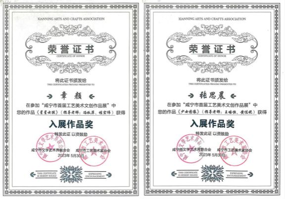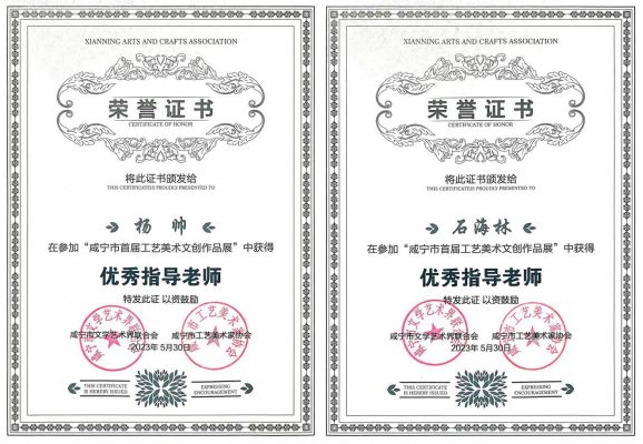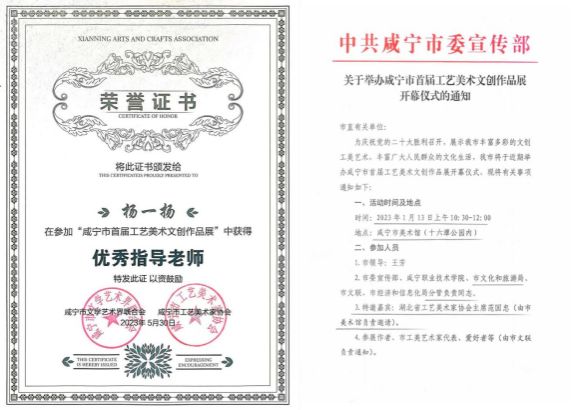 近日,咸宁市首届工艺美术文创作品展获奖名单公布,beat365在线唯一官网学生金玮琳、张思晨、王小佩、章颜、孙静仪、石芷瑞六位学生作品入选,同时教师杨帅、石海林、余娟、冯秋萍、王培恒、黄佳妮杨一扬获“优秀指导老师”称号。
