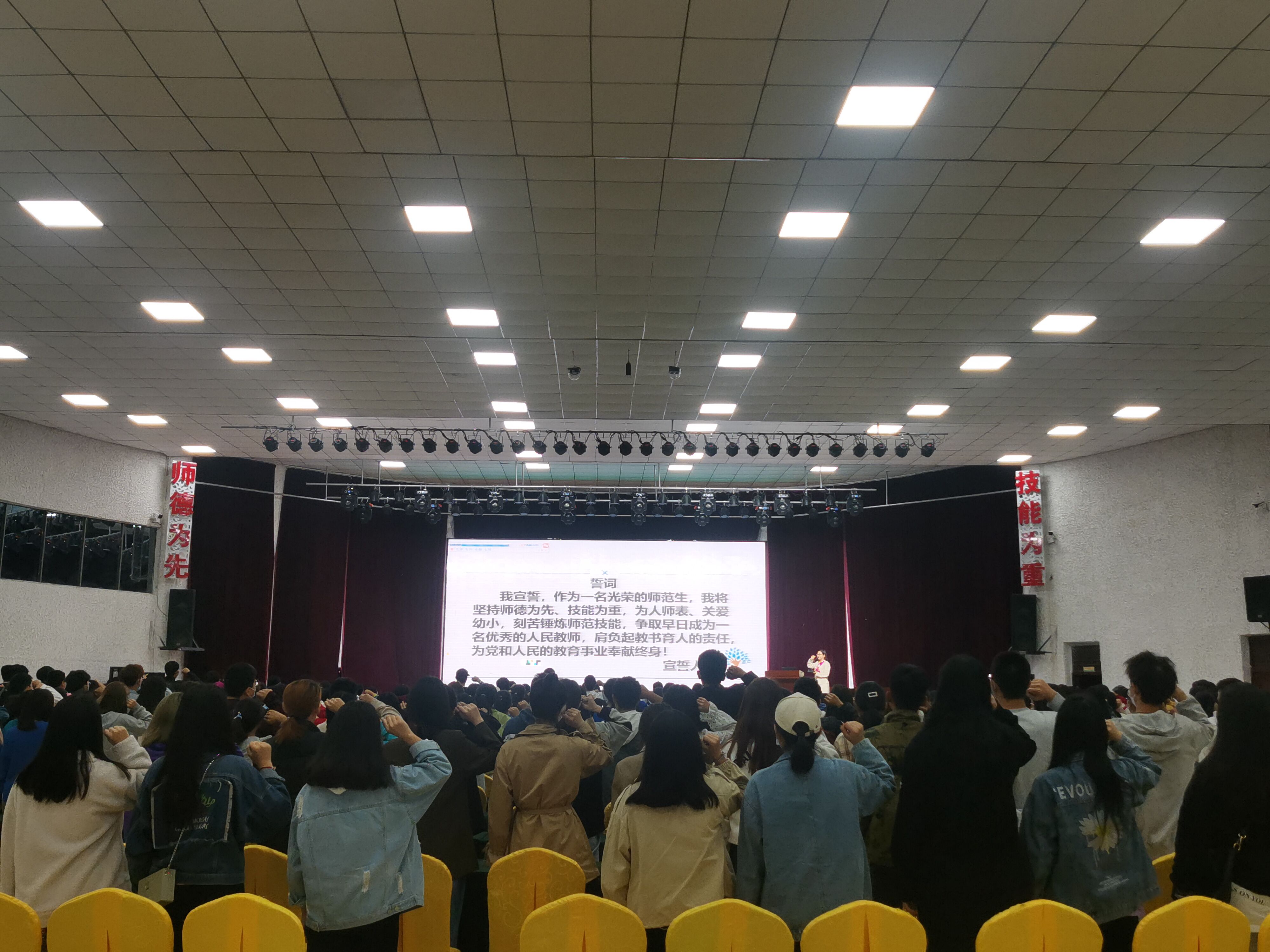 随后,语文教育专业骨干教师袁和平就学生管理队伍、课程设置、实践教学等领域对本专业教学安排进行了介绍,并对20级新生给予鼓励和期望。最后,袁和平带领全体师生进行了庄严的师范生宣誓。此次活动在一片铿锵有力的宣誓声中落下帷幕。
