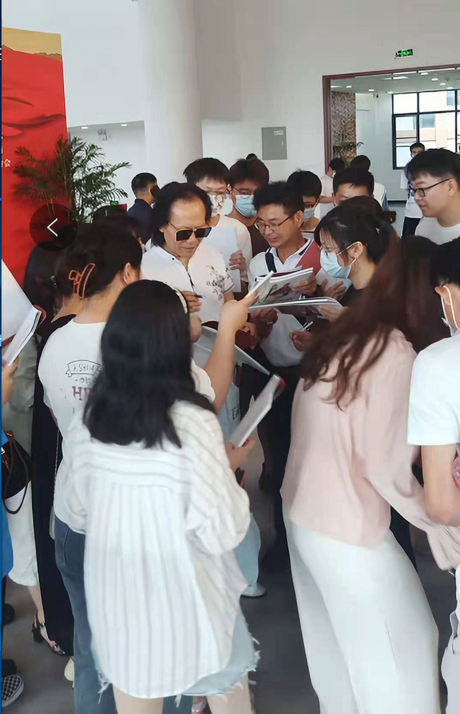 黄佳妮老师将19级艺术设计专业学生的《UI动效设计》课堂从学校移到市图书馆,学生们通过大师们的画作看到了三位书画家精湛的绘画技法、对艺术创作饱满的热情、对中国人民和中国共产党的热爱。通过与艺术大师亲密接触,把情感融入到活动中,既欣赏了优秀的艺术作品,又经历了一次深刻的红色教育。活动中同学们有幸和国家一级美术师、荣获国务院突出贡献专家称号的大画家梁岩合影,被梁岩的作品《我宣誓》打动,纷纷成为“凉粉”找梁岩要签名。师生们感叹,这样寓教于乐、开阔眼界的思政课天天上也不觉得累。