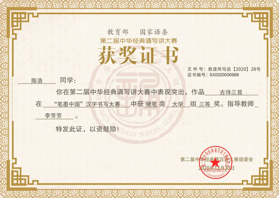 陈浩同学在第二届中华经典诵写讲大赛获“硬笔类”大学组三等奖