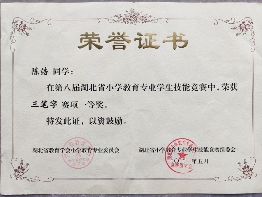 陈浩同学在湖北省第八届小教联盟比赛中获“三笔字”赛项一等奖