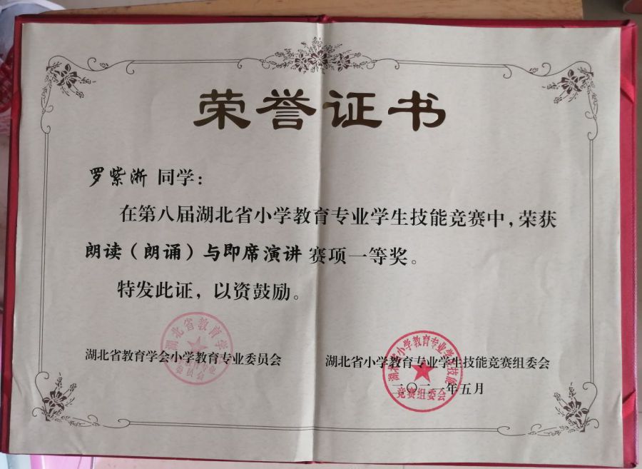 罗紫淅同学在第八届湖北省小教联盟学生技能竞赛中荣获“朗读(朗诵)与即席演讲”一等奖