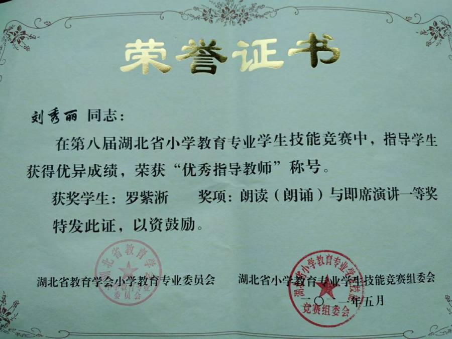 刘秀丽老师荣获“优秀指导教师”称号