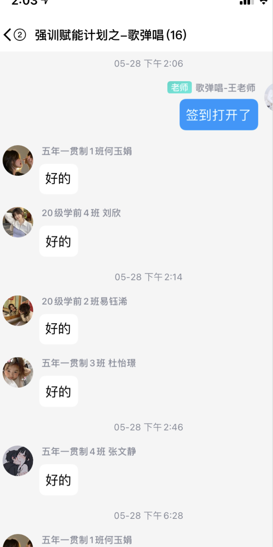 歌弹唱项目训练的曲目,来源于《技能大赛60首儿歌》。训练的平台为智慧职教云课堂,每周训练当天王华珍老师在课中发布签到,并布置课后作业,学生在规定的时间内完成作业,录制视频上传至职教云平台。