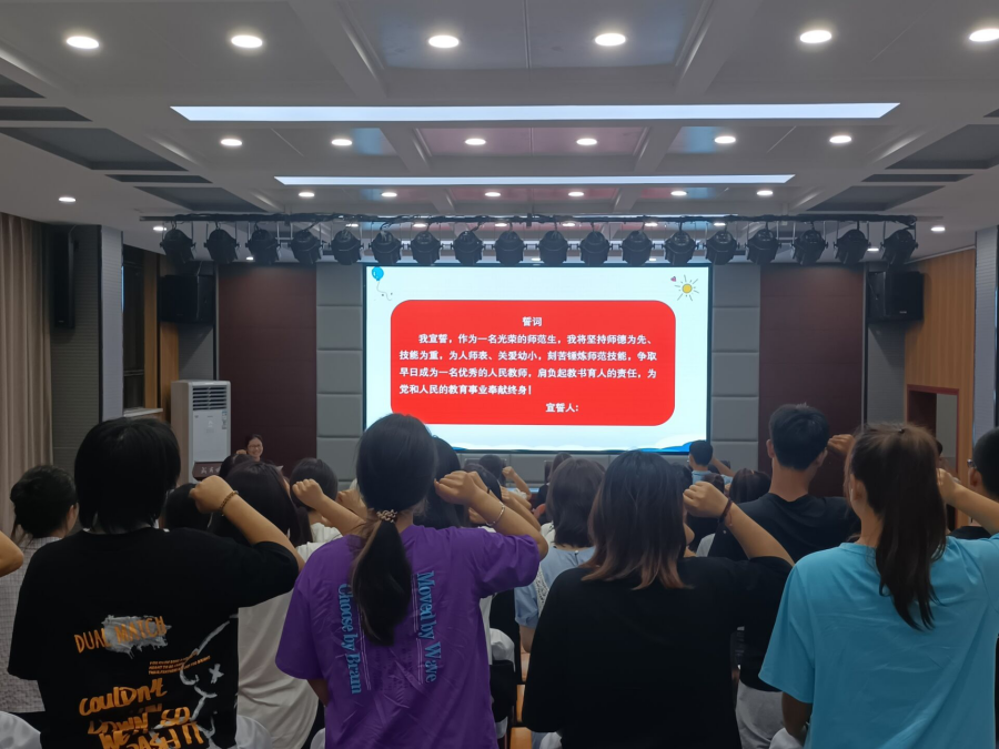 讲座最后,在袁晶晶主任的带领下,全体新生起立共读师范生誓词,在激昂澎湃的集体宣誓中,2021级新生入学教育典礼结束。