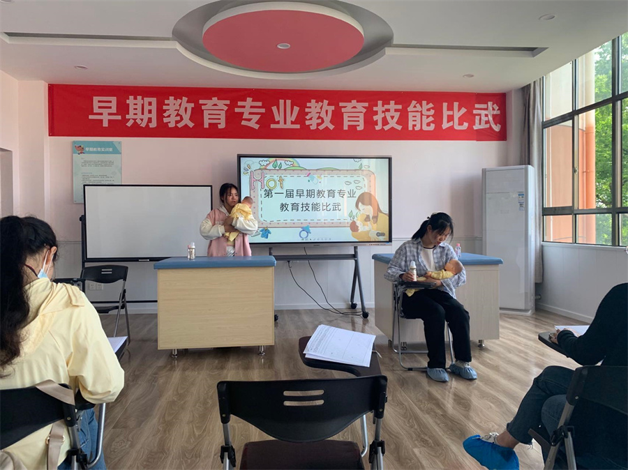 在正式比赛前,早期教育专业全体教师利用晚自习时间为学生开展了近一个月的义务技能培训,以夯实学生的关键职业技能点。5月2日上午,全体早期教育专业学生在教育实训中心104进行了项目二“0-3岁婴幼儿保育技能考核与测评”的比赛。5月18日下午和晚上在教育实训中心101和102实训室分别进行了项目一“早教教师职业素养综合测评”和项目三“早期教育亲子活动设计与答辩试讲”的比赛。