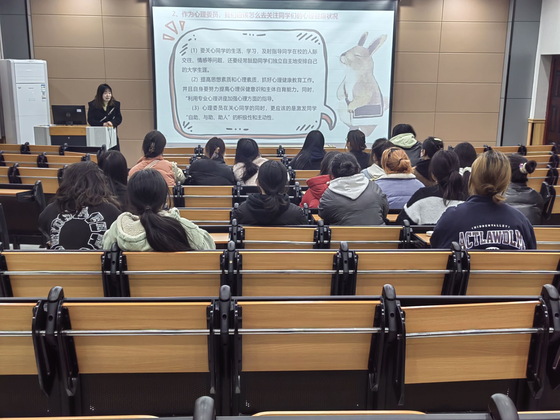 培训会上汪老师首先与各班心理委员进行了简单的交流,并从心理委员的工作意义、工作职责、心理健康与咨询常识、如何做好心理委员工作这四个方面进行详细讲解。同时,普及了相关心理知识以及如何去解决同学们的心理问题和面对不同心理隐患时应当采取的不同心理援助,还特别强调了心理委员在工作中要谨记保密、尊重等重要原则。