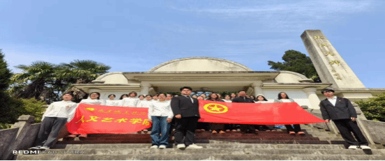 纪念碑前,全体师生列队肃立。师生代表抬着扎有“红色基因代代传”挽联的花篮拾级而上,白菊与红绸在春风中交织成壮丽的画卷。“我志愿继承先烈遗志,以艺术传承文明,用青春守护山河!”在陈晓云老师带领下,35个年轻的声音在陵园上空激荡。誓言声中,学员们将白菊轻放碑前,让阳光照亮每个曾为光明献身的名字,将红色血脉的传承化作春雨中的无声誓言。